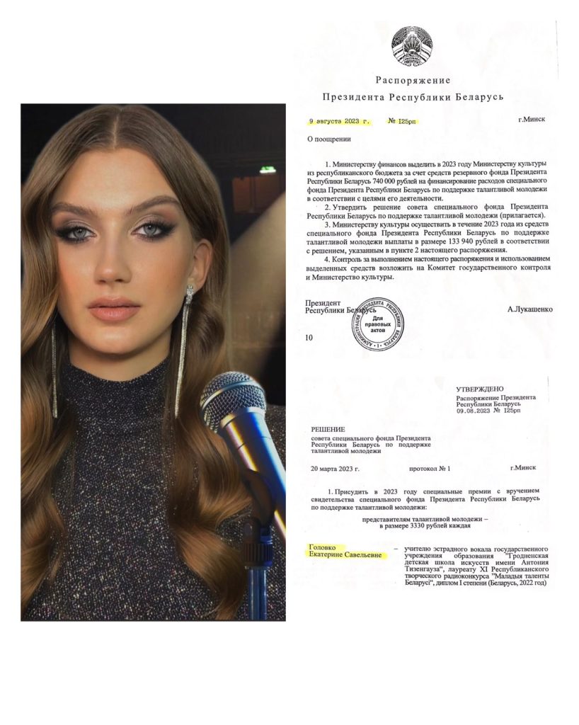 Назначена специальная премия с вручением свидетельства специального фонда Президента Республики Беларусь по поддержке талантливой молодежи в 2023 году (Решение совета специального фонда Президента Республики Беларусь по поддержке талантливой молодежи от 20 марта 2023 года протокол №1, Распоряжение Президента Республики Беларусь от 9 августа 2023 года №125 рп)